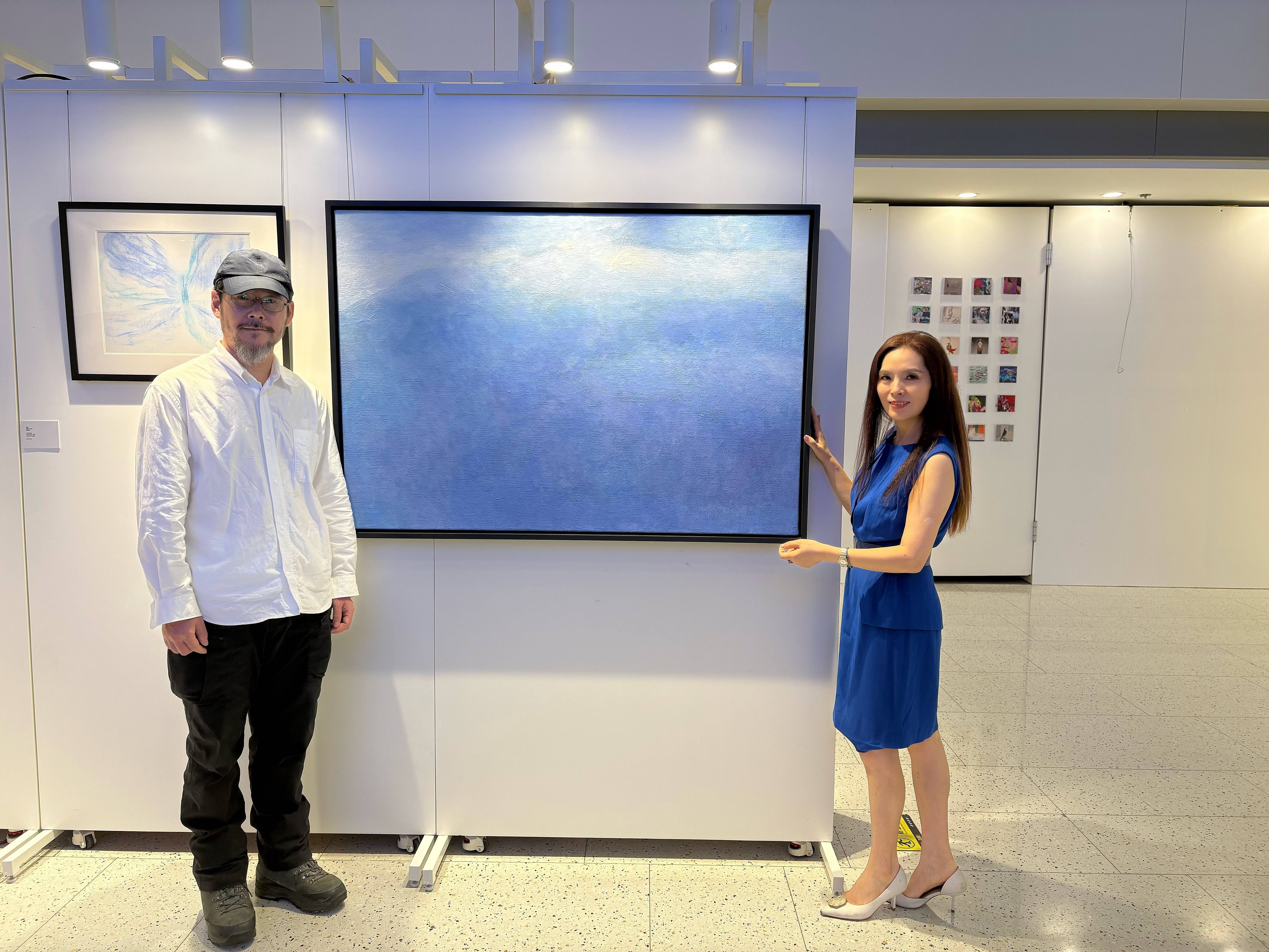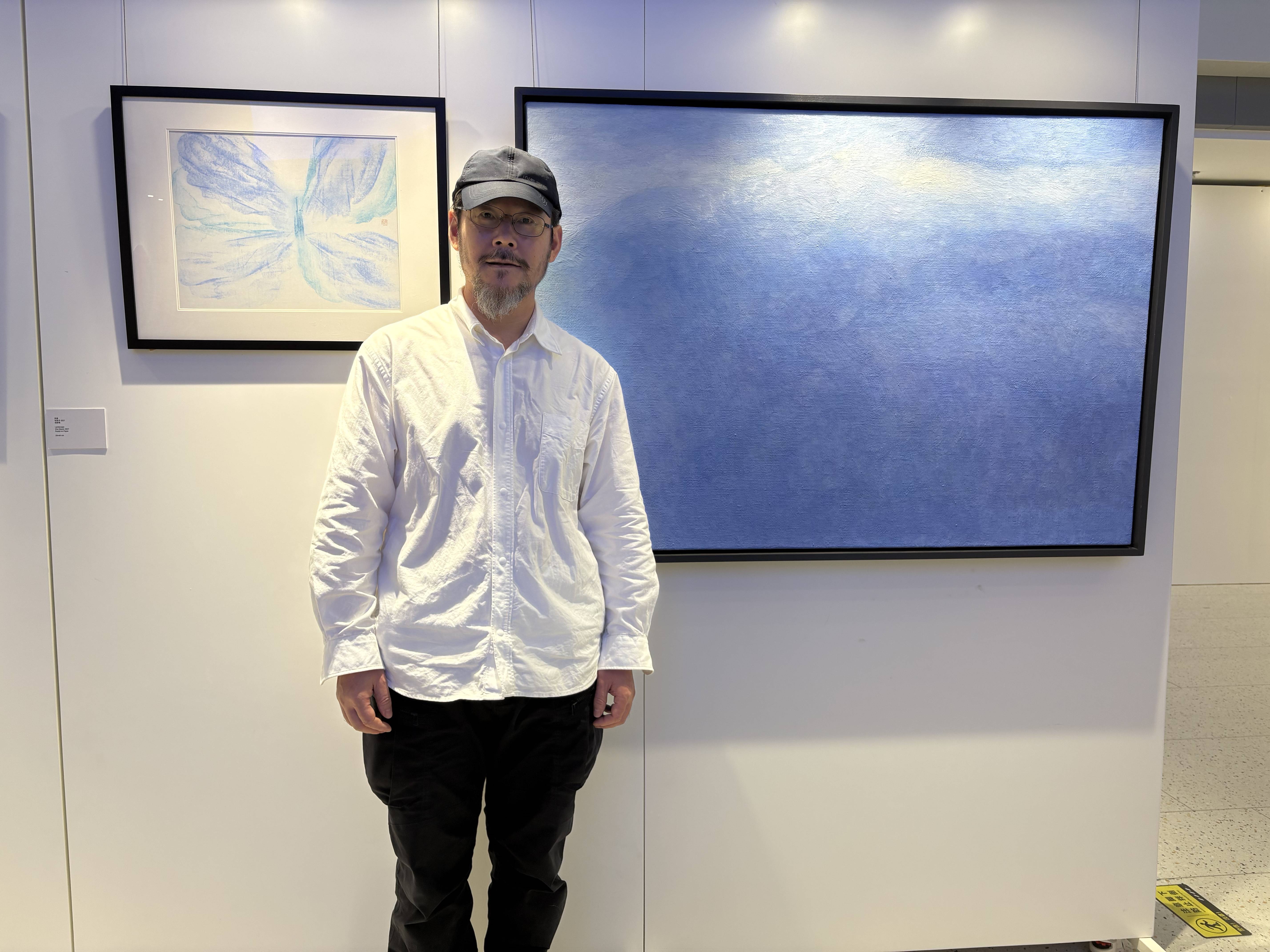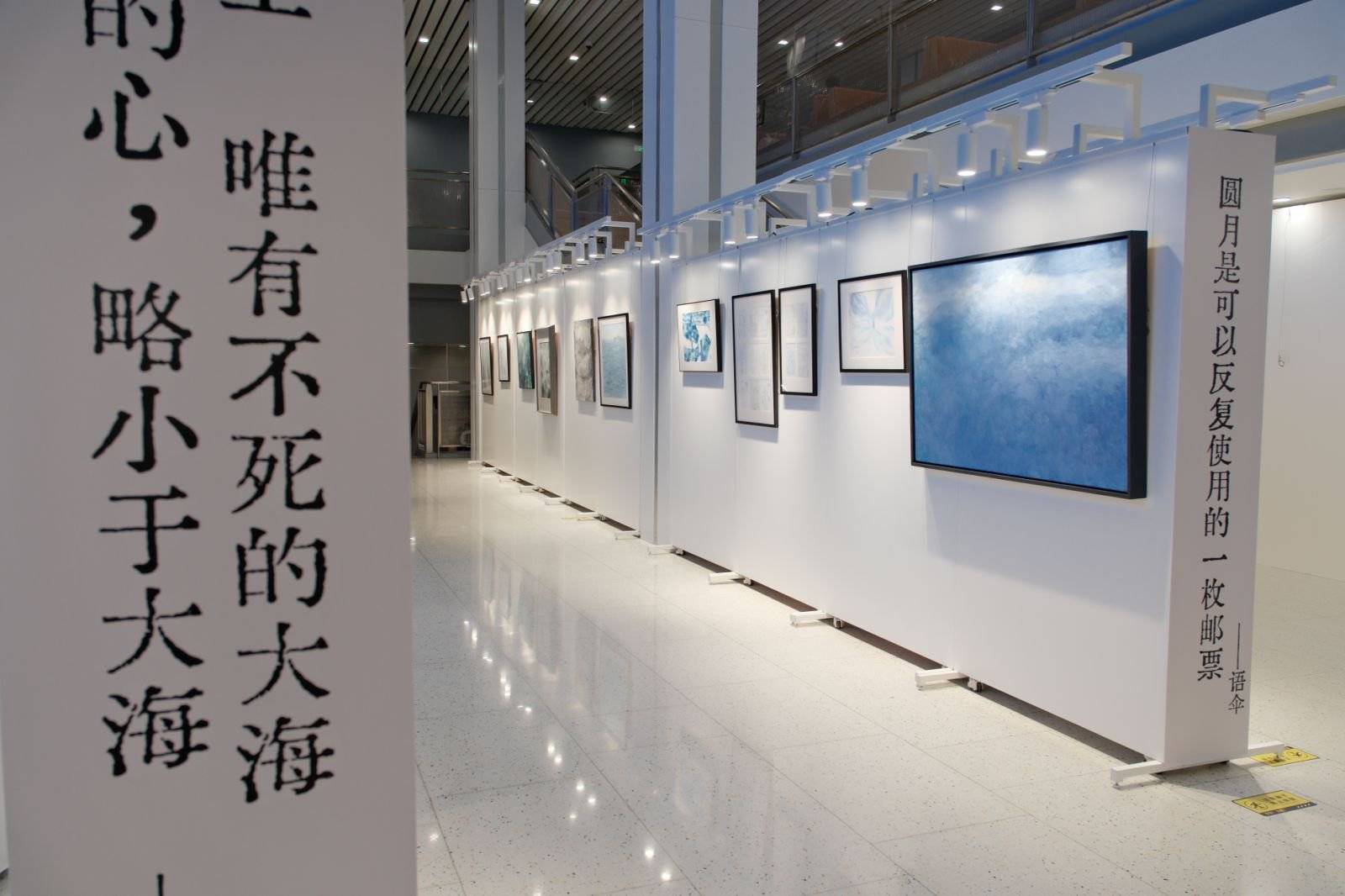 展覽匯聚了藝術(shù)家、詩人與作家的靈魂共契。30余件以藍(lán)色為基調(diào)的作品,在色彩的秩序中低徊吟唱,共筑詩意場域。這抹藍(lán),是“詩愈力”精神的視覺隱喻——心靈如天空,情緒如流云。云來云去,天空始終自在。藍(lán)是那背景般的澄明,不驅(qū)散云彩,卻承載所有漂泊的形狀。