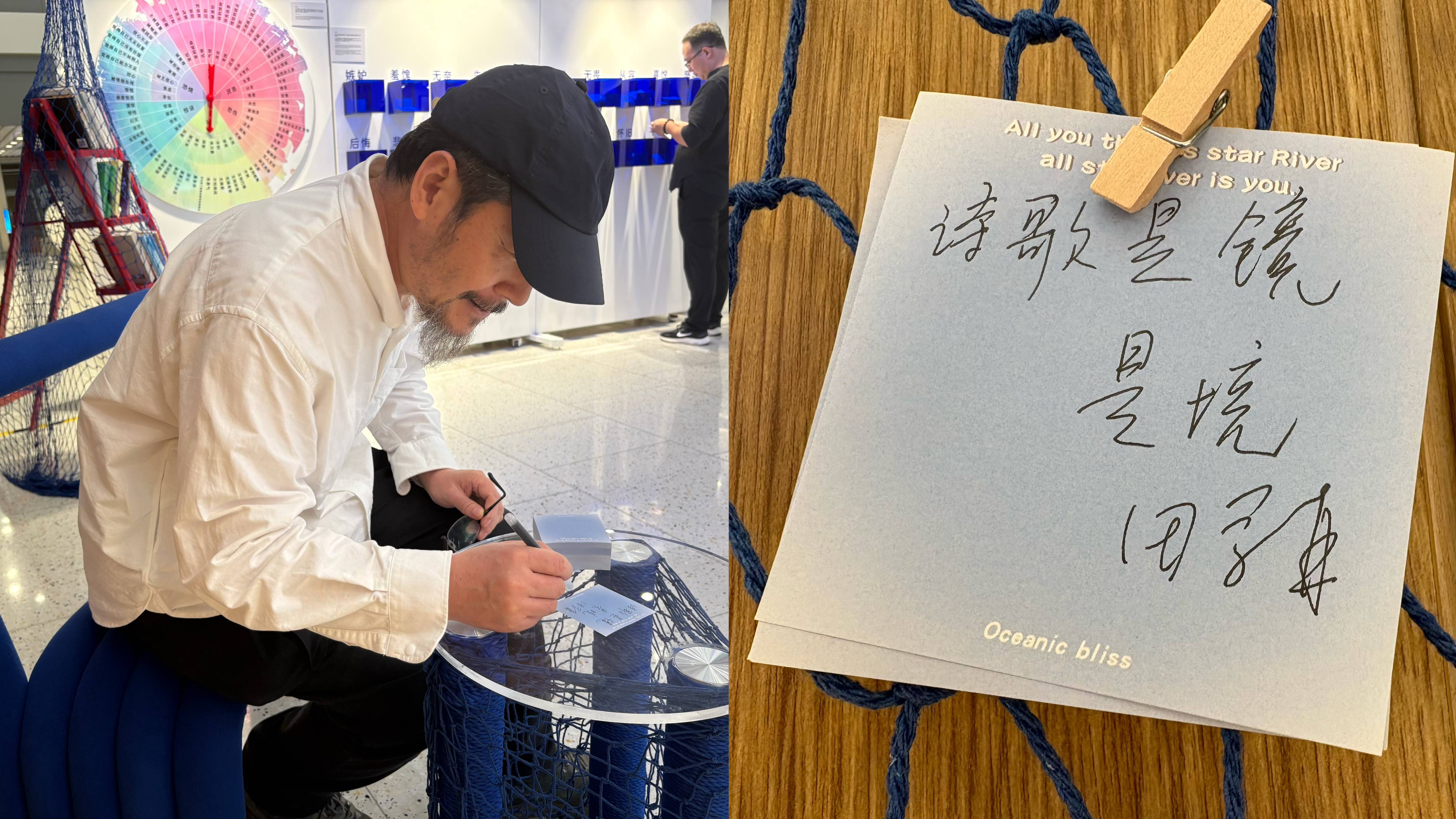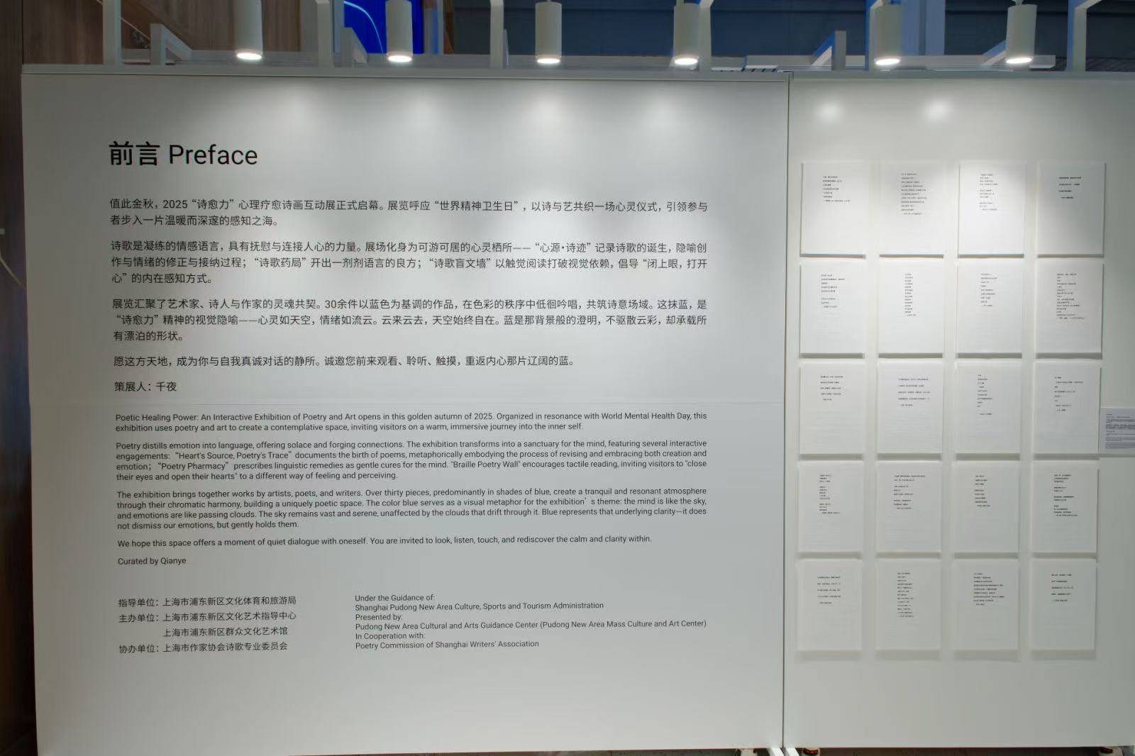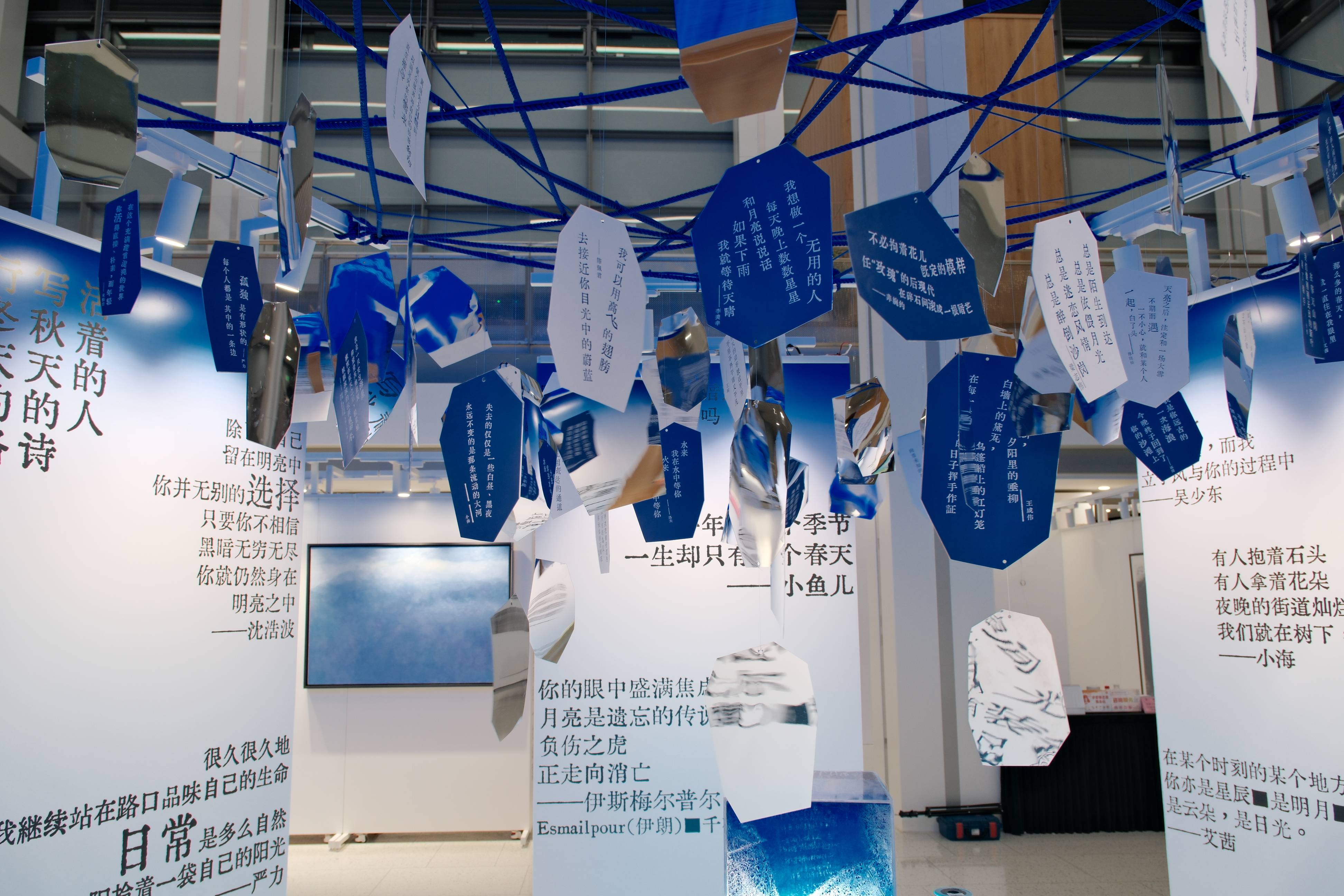 “心源·詩跡”記錄詩歌的誕生,隱喻創(chuàng)作與情緒的修正與接納過程;“詩歌藥局”開出一劑劑語言的良方;“詩歌盲文墻”以觸覺閱讀打破視覺依賴,倡導(dǎo)“閉上眼,打開心”的內(nèi)在感知方式。