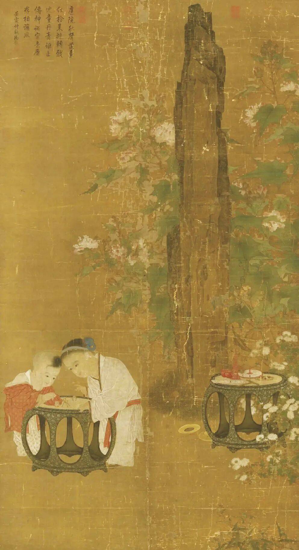 北宋 蘇漢臣 《秋庭嬰戲圖》北宋畫(huà)家蘇漢臣擅畫(huà)嬰戲題材,他繪有佳作《秋庭嬰戲圖》,此卷為其傳世極精之作。畫(huà)面描繪了在秋天的一處富家庭院里,姐弟倆正圍著螺鈿漆墩玩自制玩具的情景。畫(huà)面右側(cè),畫(huà)家精心地描繪了秋日鮮花盛開(kāi)的庭院場(chǎng)景。一叢芙蓉花花朵碩大,花色粉嫩。芙蓉花叢中一塊柱狀的山石昂然挺立,直插向上,氣勢(shì)凌人。畫(huà)面右下方,幾株雛菊花朵繁茂,花色素雅潔白,花叢中掩映著一件精美的螺鈿漆墩,上面放著八寶紋紙格、轉(zhuǎn)輪和玳瑁盤(pán)、小佛塔、寶塔棋盒等精致昂貴的兒童玩具,草地上還放著一個(gè)小鐃鈸。畫(huà)面左側(cè),姐弟倆正沉浸于眼前的游戲中。小弟弟全神貫注,衣領(lǐng)下滑,頑皮好動(dòng),姐姐耐心地照看著弟弟,表情溫和。兩個(gè)孩子沉迷于眼前的游戲,顯示出天真純真的兒童本性。欣賞此畫(huà),我們也能感受到畫(huà)面中洋溢的童真童趣。