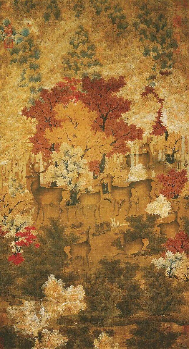 遼 佚名《丹楓呦鹿圖》五代時(shí)期遼代的一位畫(huà)家曾創(chuàng)作出絹本重彩畫(huà)作《丹楓呦鹿圖》,這幅畫(huà)是描繪秋色的名作。此畫(huà)描繪的是群鹿游憩于彩葉絢爛的秋林中的場(chǎng)景,群鹿造型生動(dòng),呼朋引伴,頗具情趣。整幅畫(huà)構(gòu)圖繁密飽滿(mǎn),色彩鮮艷熱烈,形式美感強(qiáng),具有濃重的裝飾意味。畫(huà)面描繪的是深秋季節(jié)的山林景色,深綠、花青、朱砂、胭脂……不同的顏料呈現(xiàn)出五彩繽紛的秋林美景。樹(shù)葉繁茂,樹(shù)木密集,一群鹿正在山林中嬉戲覓食,有的站立,有的蹲伏。突然,遠(yuǎn)方傳來(lái)一陣可疑的聲響,長(zhǎng)著美麗的五叉鹿角的首領(lǐng)雄鹿,警覺(jué)地豎耳聆聽(tīng),昂首遠(yuǎn)望,觀察遠(yuǎn)方是否有危險(xiǎn)。其他的鹿也略帶驚慌,扭頭朝遠(yuǎn)方望去,神態(tài)專(zhuān)注而緊張。前方一只本來(lái)臥在地上的鹿也迅速騰躍而起,做好奔跑的準(zhǔn)備。畫(huà)家巧妙地刻畫(huà)出鹿群遠(yuǎn)望的這一瞬間,令觀眾產(chǎn)生無(wú)限遐想,賞畫(huà)者都會(huì)在腦海中想象這聲響的來(lái)源,這也給畫(huà)面增添了情趣。從色彩來(lái)看,整幅畫(huà)面的主色調(diào)為紅色,使用了橘黃、朱砂、蛤粉等顏料,給人厚重典雅的感受。但畫(huà)面中又穿插有花青等冷色調(diào),水溶性顏料與礦物質(zhì)顏料相互調(diào)和,冷暖互補(bǔ),使得畫(huà)面莊重又不失靈動(dòng)。
