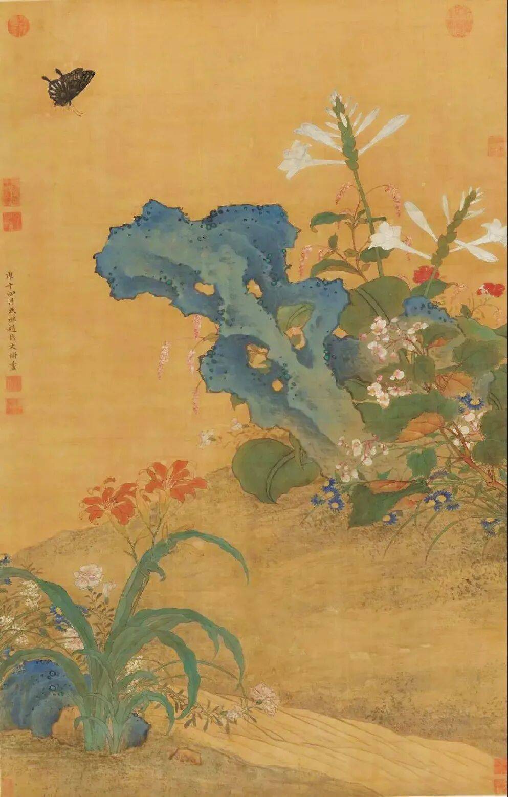明 文俶《秋花蛺蝶圖》明代畫(huà)家文俶是著名畫(huà)家文徵明的玄孫女,她擅畫(huà)花卉蟲(chóng)蝶,創(chuàng)作出諸多精美的花鳥(niǎo)畫(huà)作。她曾繪有一幅《秋花蛺蝶圖》,如今收藏于天津博物館,畫(huà)面中描繪了初秋之際花卉盛開(kāi),蝴蝶翻飛,流水潺潺的美麗景象。狹窄的溪流兩側(cè)鮮花盛開(kāi),色彩鮮艷,有藍(lán)色的雛菊、粉嫩的竹節(jié)海棠、橘色的萱草、白色的玉簪、粉白的紅蓼、艷紅的石竹以及其他諸種草花。挺拔嶙峋的太湖石立于花草之間,既豐富了畫(huà)面內(nèi)容,增添畫(huà)面層次,又調(diào)和了畫(huà)面色彩。畫(huà)面左上方,一只黑色蝴蝶被繁花吸引而來(lái),正扇動(dòng)翅膀,緩緩落下。畫(huà)家對(duì)花卉的刻畫(huà)十分精準(zhǔn),傳神勾勒出不同花卉的花朵形態(tài)。在刻畫(huà)萱草花朵時(shí),畫(huà)家綜合運(yùn)用留白、勾線(xiàn)、暈染等多種手法,巧妙呈現(xiàn)出花瓣上的色彩變化和紋理結(jié)構(gòu),使筆下的花卉生動(dòng)傳神,別具風(fēng)姿。