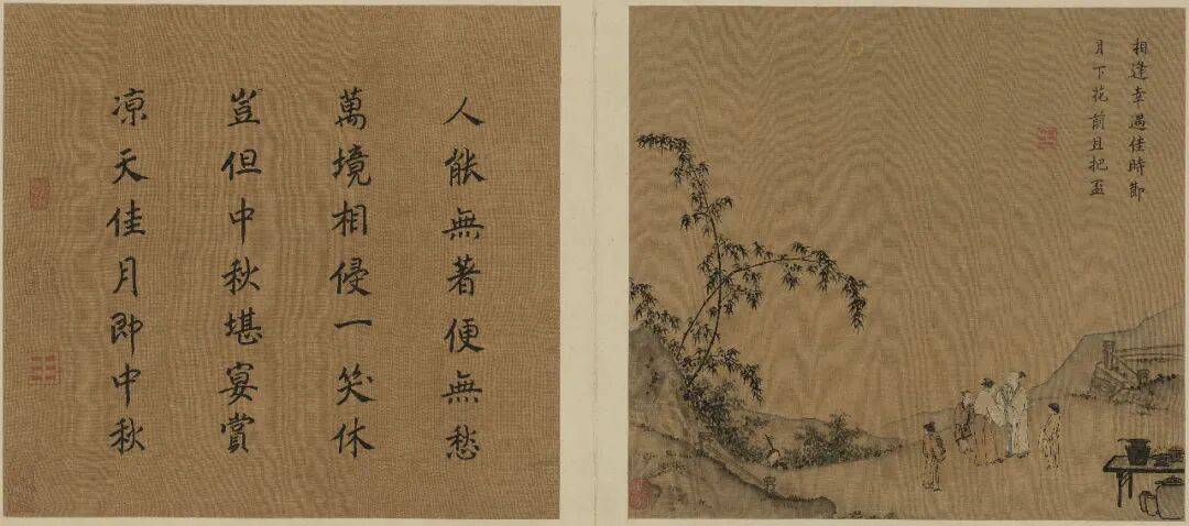 南宋 馬遠(yuǎn) 《月下把杯圖》白日里的秋景秀美多姿,夜色中的秋景素雅曠落。唐代詩(shī)人王建寫(xiě)有名句“中庭地白樹(shù)棲鴉,冷露無(wú)聲濕桂花”,描繪出秋夜的靜謐曠遠(yuǎn)。在這美好的秋夜,有許多人走出房屋,走向庭院、曠野,在花間樹(shù)下和好友一起品茗、賞月、觀花、飲酒、暢聊,此乃人生一大樂(lè)事也!南宋畫(huà)家馬遠(yuǎn)繪有《月下把杯圖》,此畫(huà)描繪了中秋月夜文人高士團(tuán)聚賞月的美好場(chǎng)景。畫(huà)面為郊外山野一隅,月夜里翠竹俊秀,隨微風(fēng)擺動(dòng),皎潔月輪高懸于空,散發(fā)金黃色光芒。兩位高士把酒賞月,暢聊人生,案幾上擺放著各式供品,四周花竹掩映,營(yíng)造出月下花前濃濃的詩(shī)意。不遠(yuǎn)處的小路上,一位童子正捧阮拾級(jí)而來(lái),似乎兩位高士接下來(lái)要撥阮奏樂(lè),此情此景,讓人沉醉。畫(huà)面上有題詩(shī):“相逢幸遇佳時(shí)節(jié),月下花前且把杯”,生動(dòng)地概括出美麗的景色和畫(huà)中人之間濃厚的情意。佛家有個(gè)說(shuō)法叫“一期一會(huì)”,這種美好的相遇終其一生只會(huì)有這一次。美麗的秋日山林盡染、秋色絢爛、瓜果飄香、天氣明凈,豐收的喜悅和斑斕的秋色交織在一起,寫(xiě)成壯美的詩(shī),繪就瑰麗的畫(huà),帶給人們無(wú)盡的感動(dòng)與身心享受。人們珍惜這短暫易逝的美好韶華,走出房門(mén),走入山林,走向曠野,感受秋風(fēng)的溫柔、秋山的多彩、秋林的熱烈、秋花的恣肆、秋水的曠落、秋月的皎潔、秋果的豐盈、秋蟲(chóng)的機(jī)敏,這世間萬(wàn)物仿佛因秋的到來(lái)而多了些許溫柔和詩(shī)意。丹青展卷,秋色斑斕。丹青妙手將美麗秋色轉(zhuǎn)化為精美畫(huà)卷,跨越時(shí)光流轉(zhuǎn)永恒流傳,短暫的秋色因此得以長(zhǎng)存。當(dāng)我們欣賞這一幅幅描繪秋色的美麗畫(huà)卷,不僅可以品味到如詩(shī)的秋,更能體悟到畫(huà)中深邃的思、濃濃的情,這一刻,我們的心也和畫(huà)家緊密相連。
