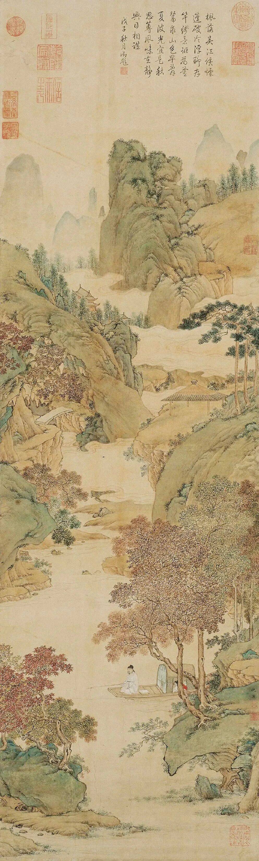 明 仇英 《楓溪垂釣圖》在這大美秋光中,有人于室內(nèi)讀書(shū)品茶,有人在庭院中賞花嬉戲,也有人走向野外,感受山水林木間的多彩秀色。明代畫(huà)家仇英繪有《楓溪垂釣圖》,描繪的就是高士在斑斕秋色中于水畔釣魚(yú)的場(chǎng)景。畫(huà)面中展示了深秋時(shí)節(jié)遼闊明凈的山川郊野景象,遠(yuǎn)處的樓閣隱現(xiàn)于山間叢林和流蕩的云霧中,中景處層巒疊嶂,山間云霧繚繞,懸崖上棧道蜿蜒,水畔平地上的草亭開(kāi)闊寬敞。山水之間遍布蒼松古柏、黃櫨紅楓,樹(shù)葉紅艷,秋色迷人。近景為紅楓掩映的溪江,水面上,一位身著素色朝服的士人靜坐在輕舟上垂釣,神情專(zhuān)注,怡然自得,正享受著這難得的閑暇。畫(huà)面中高嶂巨壁,丘壑深遠(yuǎn),筆墨純熟,設(shè)色古樸,整幅畫(huà)作氣勢(shì)雄渾,景色秀美,精致迷人,給人以心曠神怡之感。