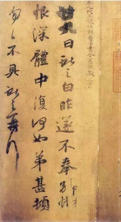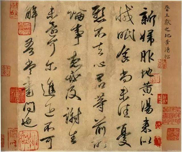 王獻(xiàn)之《新婦地黃湯帖》,唐人摹本。紙本,縱25.73厘米,橫24.0厘米。地黃湯乃一中藥名,這是有關(guān)該藥的尺牘。王獻(xiàn)之真跡未能傳承至今,作為模本墨跡有數(shù)種傳世,其中之一即此《地黃湯帖》,全篇書(shū)風(fēng)柔韌兼?zhèn),沉著軒昂,一氣呵成?/div>