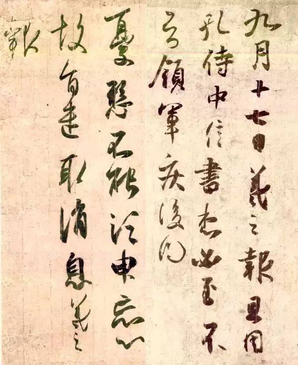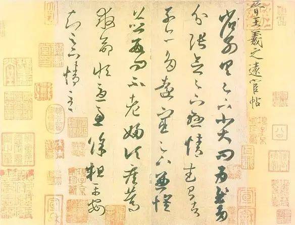 《鴨頭丸帖》,行草,唐摹本。王獻(xiàn)之書(shū)。絹本,縱二六·一厘米,橫二六·九厘米。上海博物館藏。此帖為王獻(xiàn)之給友人的便札,是他行草的代表作。起首是尋常應(yīng)答,故運(yùn)筆稍緩,似行書(shū)。后半部分筆底漸活,運(yùn)筆漸快,行筆流暢靈動(dòng),更接近草書(shū),欲與朋友晤談的迫切心情,躍然紙上。
