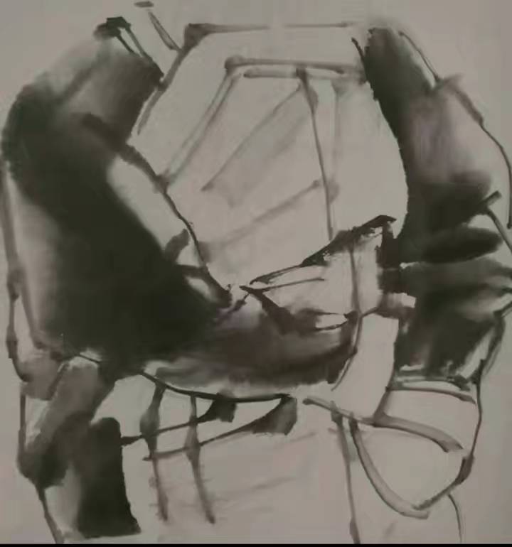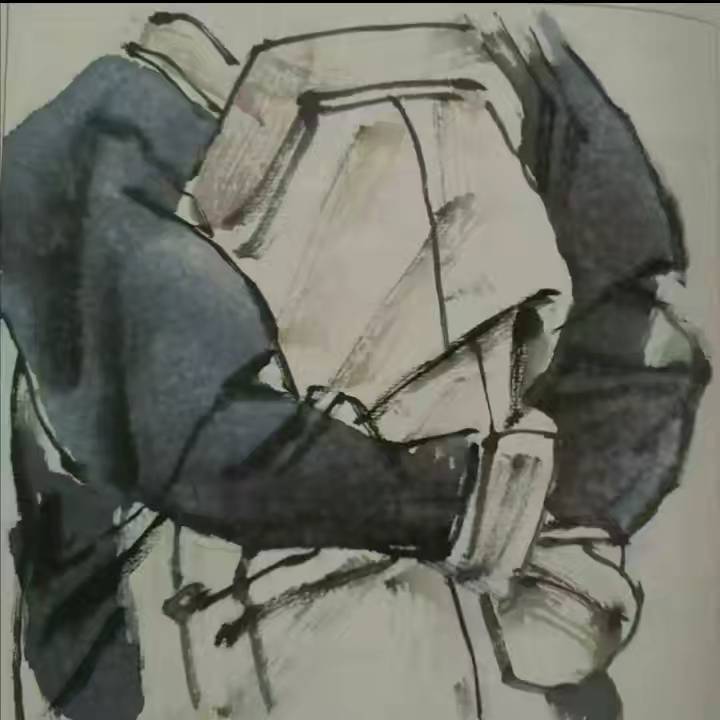 有意識的弱化線條,強(qiáng)調(diào)用墨的塊面,線與墨互襯。蘸墨時(shí)注意干濕對比,在濕墨旁,畫焦墨,還要注意每筆之間留空,注意筆觸。