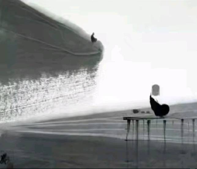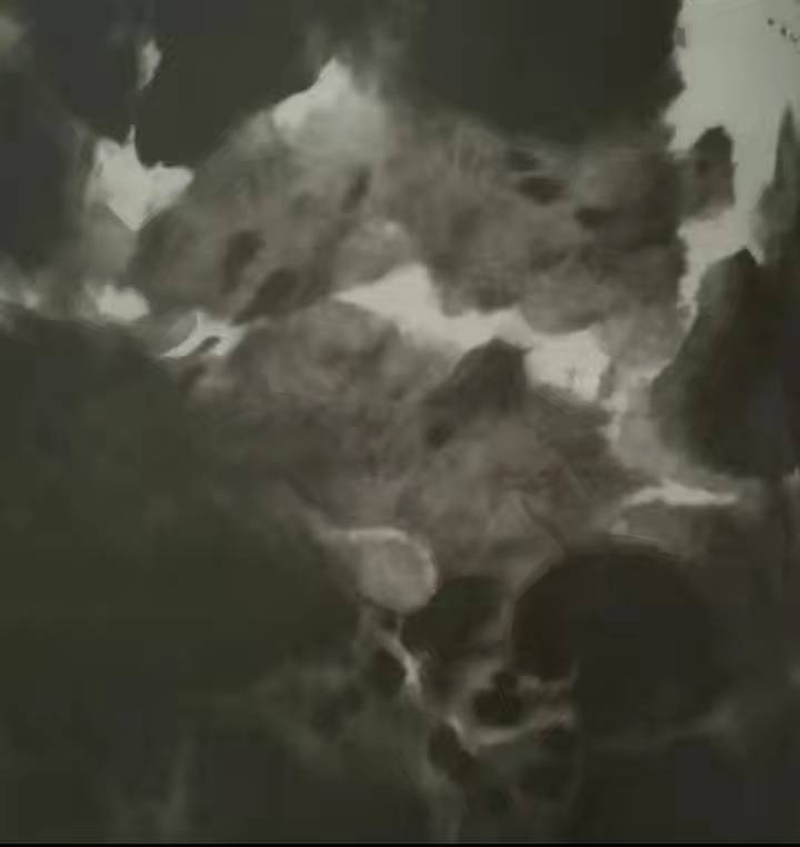 為讓主體凸顯出來,用大筆,飽蘸水,再蘸中墨,筆尖蘸重墨,一邊用手蘸清水弾在畫面上,一邊在有水的紙上拖筆捻成云霧狀,清水流動,墨色互滲,產(chǎn)生偶然的,變化的煙云霧象。