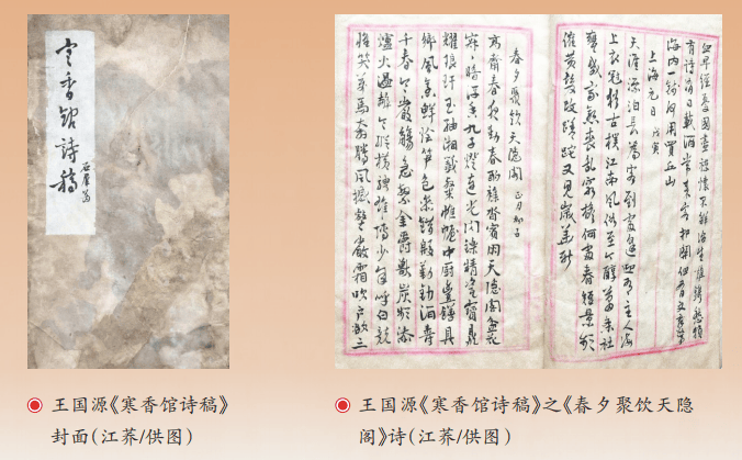 在楊庶堪詩(shī)集中,時(shí)見(jiàn)王仁泉其人。王仁泉即王國(guó)源,四川西充人,后任四川省博物館研究員。他曾有一段時(shí)間與楊庶堪同時(shí)寓居上海,并師事楊庶堪習(xí)詩(shī)。王國(guó)源有詩(shī)集《寒香館詩(shī)稿》,是一本未刊手稿,其中一首作于民國(guó)戊寅(1938)春節(jié)期間的詩(shī)《春夕聚飲天隱閣(正月初五)》,寫在楊庶堪居宅“天隱閣!毖缇鬯(jiàn),瓷器精美,字畫古雅,川味豐醇,是少見(jiàn)的一首外客描繪楊庶堪上海生活的詩(shī)。以下略錄詩(shī)的前半部分,可窺一斑:高齋春夜動(dòng)春酌,雜沓賓朋天隱閣。盆花寂寂暗浮香,九子燈連光閃爍。精瓷寶鼎耀瑯玕,玉軸湘簽燦帷幄。中廚豐饍具鄉(xiāng)風(fēng),烹鮮燴筍色參錯(cuò)。殷勤勸酒壽千春,寒嚴(yán)觴急繁金爵。獸炭頻添爐火溫,辭言縱橫騁雄博……