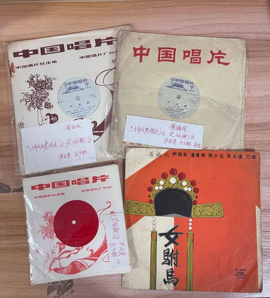 館藏黃梅戲檔案資料有老曲譜、黑膠唱片、演出劇照、錄音磁帶等,其中《天仙配》一組唱片共3張,于1962年錄制、1979年出版,泛黃的封面上印有“中國唱片”四字,中間的唱片信息介紹有劇名、演員以及伴奏樂隊等。這些檔案記錄了當年黃梅戲表演藝術家嚴鳳英、王少舫深厚的戲曲功底和精湛的演繹成就,將七仙女與董永之間凄美的愛情故事詮釋得如泣如訴、感人至深,堪稱黃梅戲經典傳世之作。