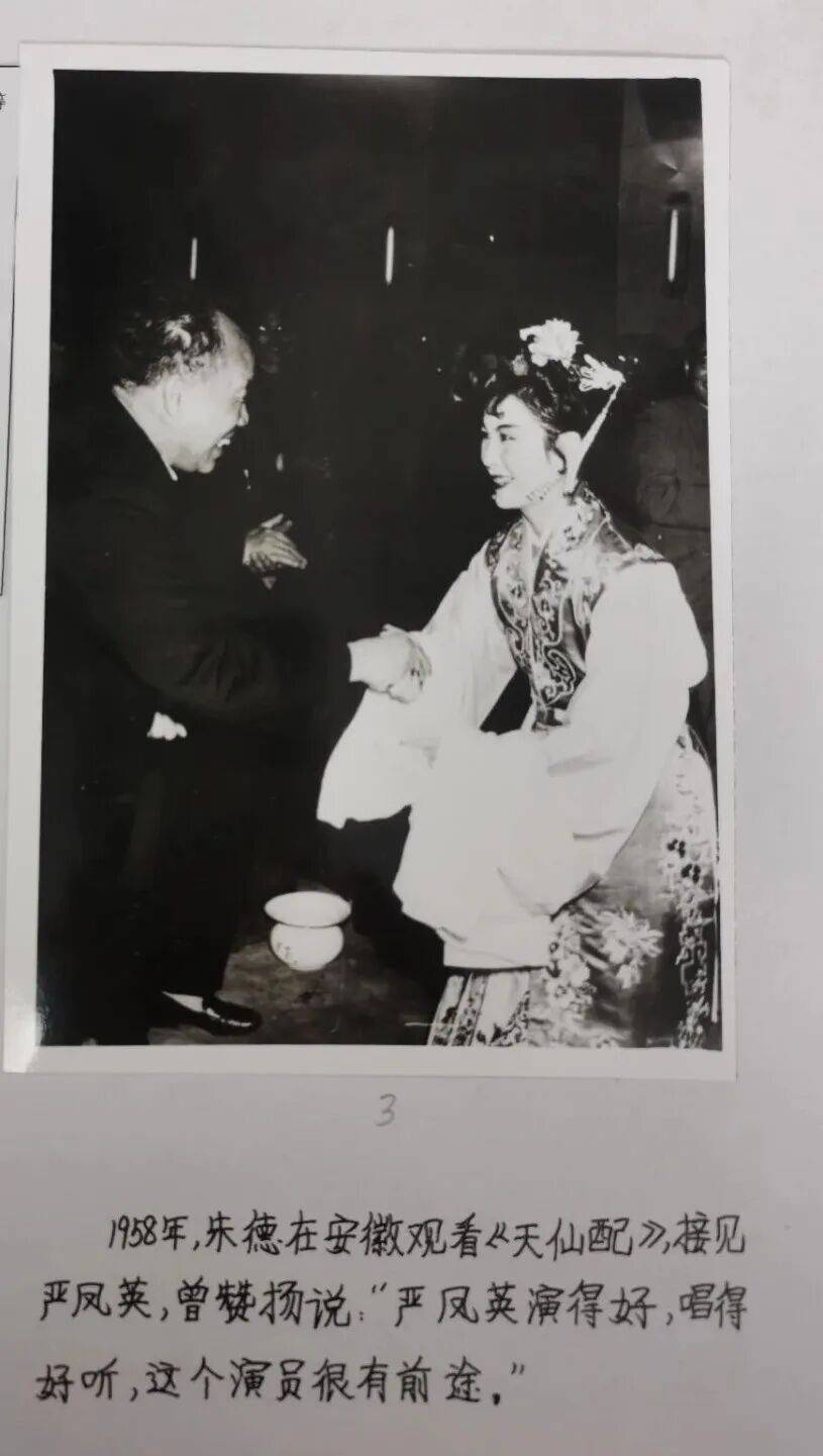 1958年,朱德在安徽觀看《天仙配》后接見嚴鳳英。(翻拍黃梅戲照片檔案)
