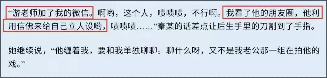 秦雯還說(shuō)游本昌拿信佛立人設(shè),原因是游本昌加了她的微信,她從游本昌朋友圈看到眾多關(guān)于佛的內(nèi)容。